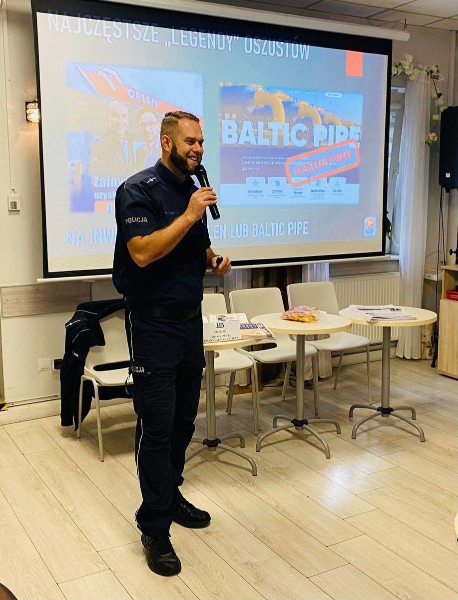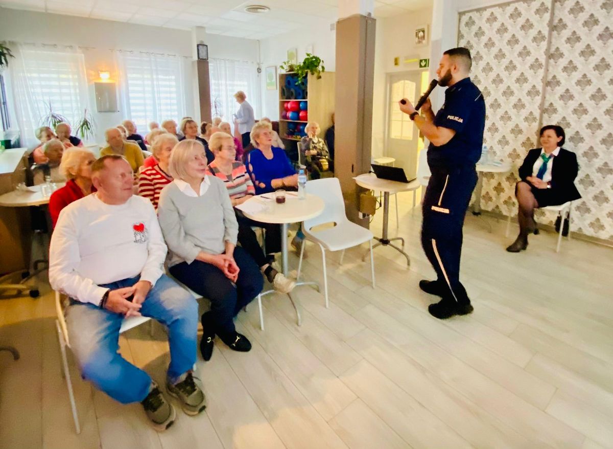 Policjant wyjaśniał, jak rozpoznać podejrzane sytuacje, na co zwracać uwagę i jakie zachowania minimalizują ryzyko stania się ofiarą oszustwa. Seniorzy dowiedzieli się, że ostrożność, sprawdzanie źródeł informacji i natychmiastowe konsultowanie wątpliwych sytuacji z rodziną lub Policją może uchronić przed poważnymi stratami.