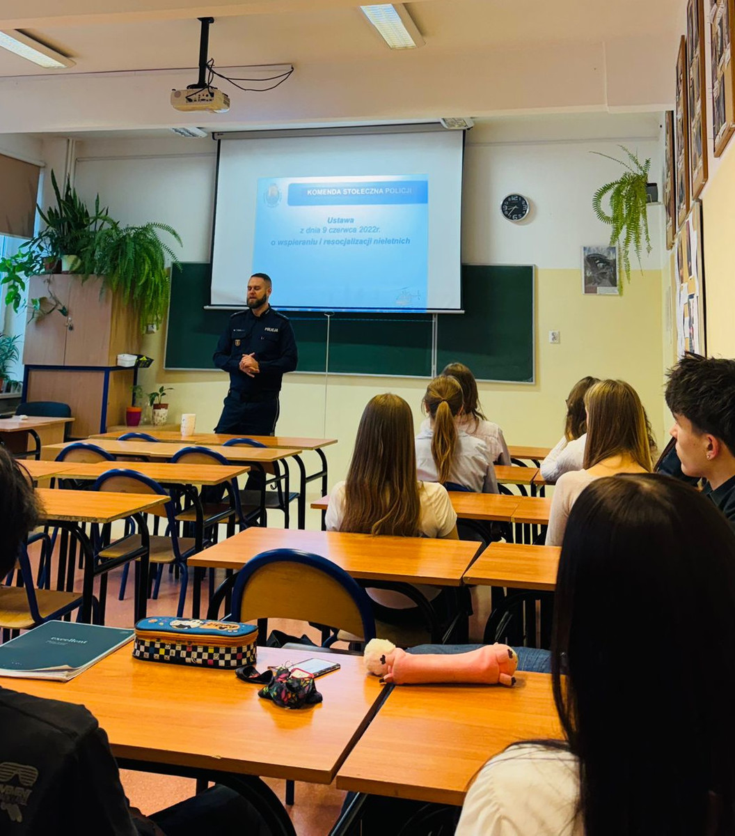 Podczas spotkania z młodzieżą z Zespołu Szkół nr 18 w Warszawie, w skład którego wchodzą: Liceum Ogólnokształcące im. Władysława Stanisława Reymonta oraz Technikum Księgarskie im. Stefana Żeromskiego, bielański profilaktyk przybliżył uczniom specyfikę pracy Policji oraz perspektywy zawodowe, jakie oferuje służba w formacji.