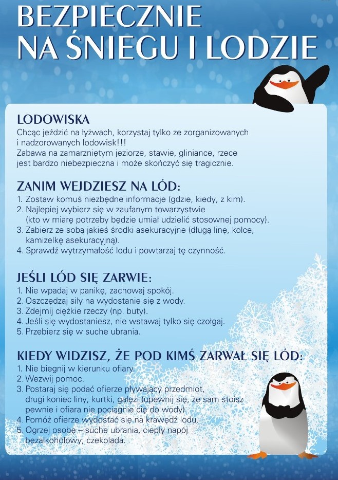 - Bez opieki dorosłych nie wchodź na zamarznięte stawy, jeziora, a tym bardziej rzeki!