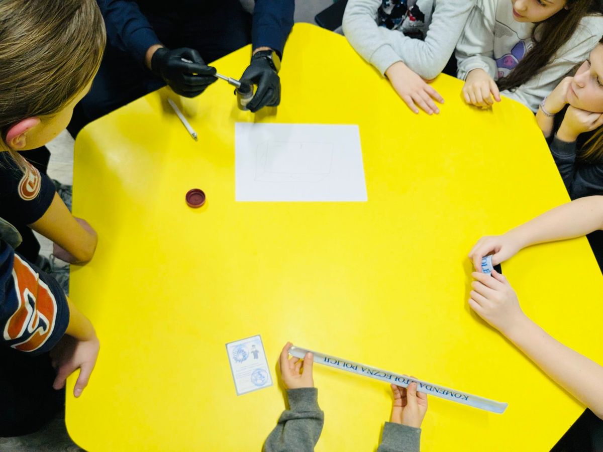 W trakcie wizyty zaprezentowany został sprzęt policyjny wykorzystywany w codziennej pracy funkcjonariusza. Dzieci i młodzież mogły z bliska zobaczyć wyposażenie policjanta oraz dowiedzieć się, do czego służą poszczególne elementy umundurowania i sprzętu technicznego. Uczestnicy spotkania chętnie zadawali pytania i z zainteresowaniem słuchali opowieści o policyjnej służbie. Podczas spotkania policjant w przystępny sposób opowiedział również o pracy technika kryminalistyki oraz o tym, jak ważne znaczenie w prowadzonych postępowaniach ma właściwe zabezpieczanie śladów. Wyjaśnił, na czym polegają czynności wykonywane na miejscu zdarzenia i jaką rolę odgrywa dokładność oraz ostrożność w tego typu działaniach. W ramach zajęć funkcjonariusz wykonywał odbitki linii papilarnych chętnym dzieciom, przybliżając im jeden z elementów policyjnej pracy.