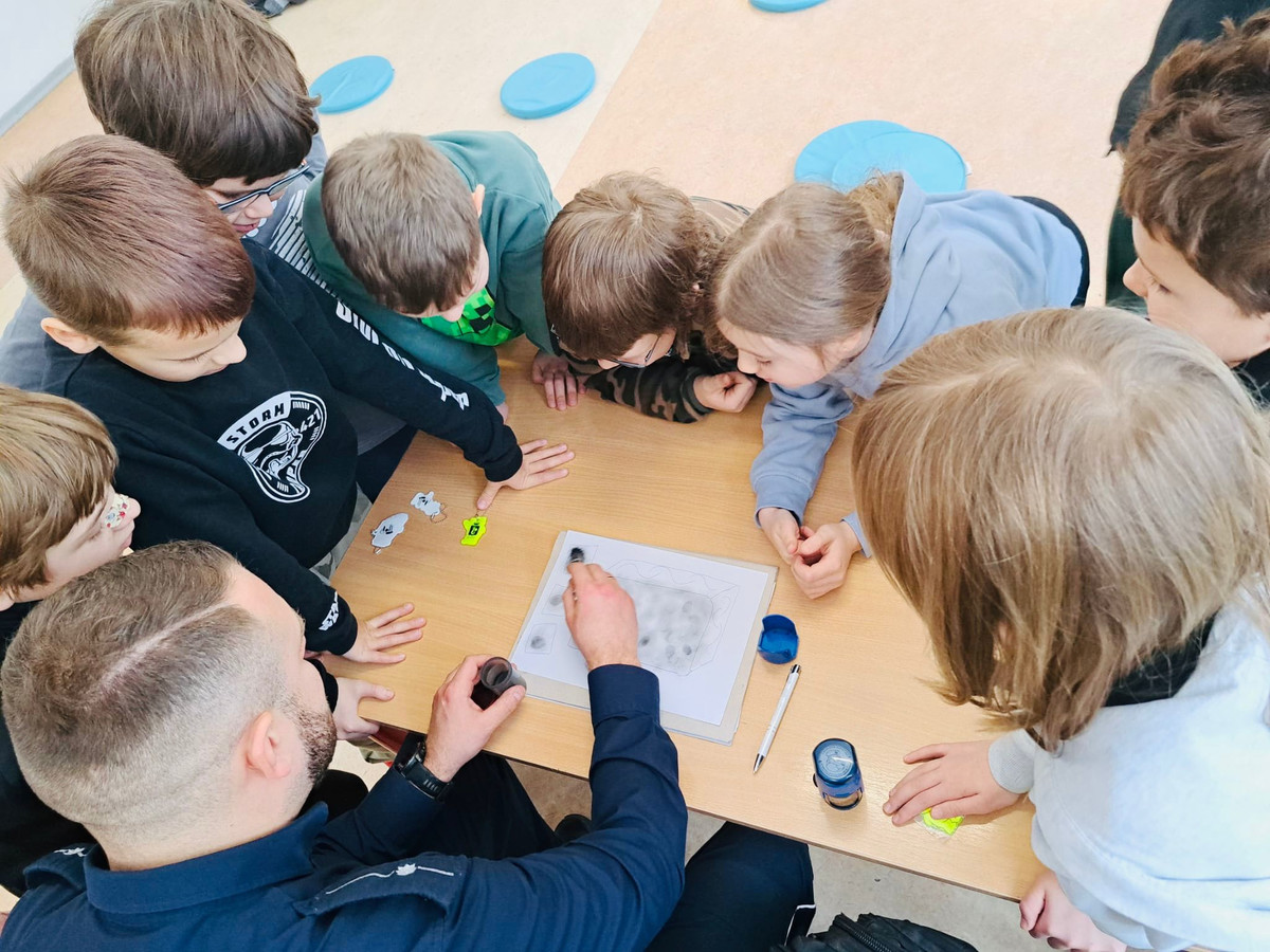 Podczas spotkania funkcjonariusz przybliżył dzieciom, czym naprawdę zajmuje się policjant na co dzień – jak chroni ludzi, reaguje w sytuacjach zagrożenia i pomaga tym, którzy znaleźli się w trudnej sytuacji. Uczniowie dowiedzieli się, że policjanci interweniują m.in. w przypadku kradzieży, wypadków i kolizji drogowych, aktów przemocy czy zgubienia się osób potrzebujących pomocy, a także w wielu innych sytuacjach, gdzie liczy się szybka reakcja i wsparcie. Dzieci mogły również poznać podstawy udzielania pierwszej pomocy w sytuacjach, które mogą zdarzyć się w szkole lub w domu. Funkcjonariusz tłumaczył, jak w razie wypadku lub nagłego zachorowania wezwać pomoc przez numer 112, jak udzielić wsparcia rannej koleżance lub koledze, jak zachować spokój i działać odpowiedzialnie do czasu przyjazdu służb ratunkowych.