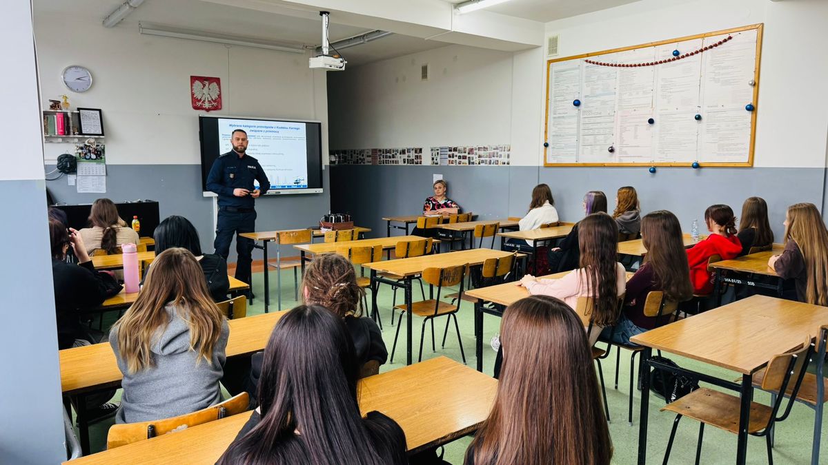 Policjant dzielił się też praktycznymi wskazówkami dotyczącymi przygotowania do służby i rozwoju kompetencji, zachęcając młodzież do refleksji nad własnymi predyspozycjami i zainteresowaniami w kontekście pracy w mundurze. Całość spotkania miała charakter interaktywny, a uczniowie aktywnie włączali się w rozmowy, zadawali pytania o realia służby, omawiali scenariusze działań w różnych sytuacjach i wymieniali doświadczenia z codziennego życia, a policjant reagował na ich spostrzeżenia, wyjaśniał wątpliwości i dzielił się praktycznymi wskazówkami. Dzięki temu przekaz był żywy i angażujący, a młodzież mogła w pełni zobaczyć, jak teoria łączy się z praktyką oraz jak ważna jest rola Policji w codziennym życiu obywateli.