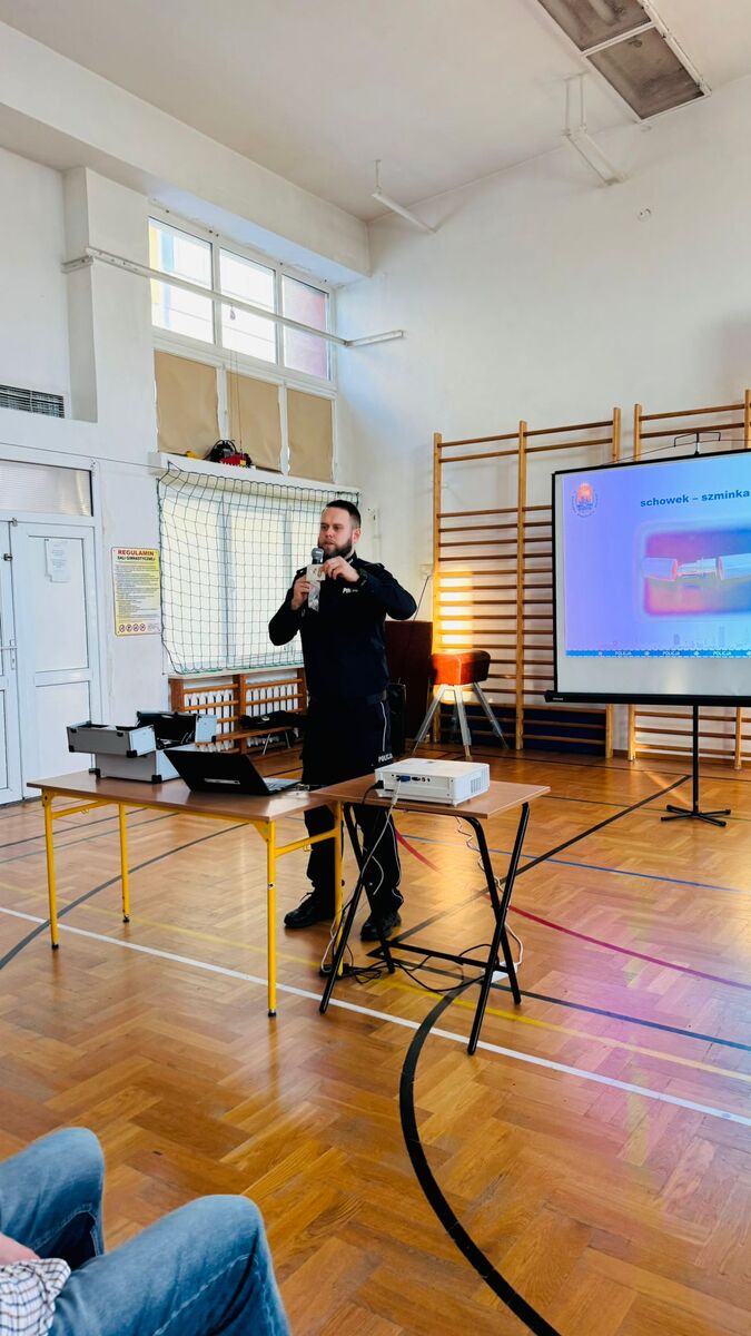 Podczas rozmowy policjant omówił najważniejsze zagrożenia związane z sięganiem przez młodych ludzi po narkotyki oraz inne substancje psychoaktywne. W trakcie spotkania poruszono także kwestie dotyczące pierwszych sygnałów ostrzegawczych, które mogą wskazywać, że uczeń ma kontakt ze środkami odurzającymi. Policjant zwrócił uwagę na zmiany w zachowaniu młodych ludzi, nagłe pogorszenie wyników w nauce, problemy z koncentracją czy wycofywanie się z relacji rówieśniczych. Podkreślił, że szybka reakcja dorosłych oraz uważna obserwacja uczniów może pomóc w odpowiednio wczesnym zauważeniu problemu.