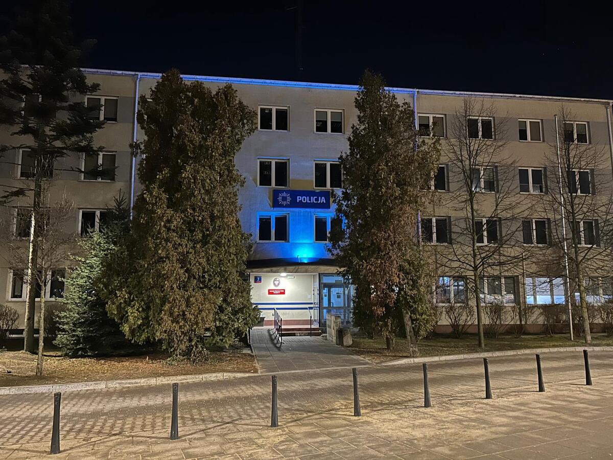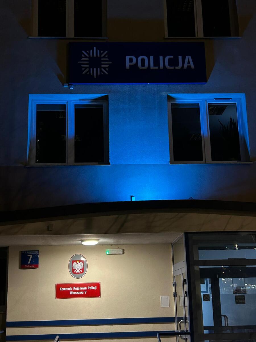 Do obchodów przyłączyła się również Komenda Rejonowa Policji Warszawa V. Budynek jednostki został podświetlony na niebiesko.
