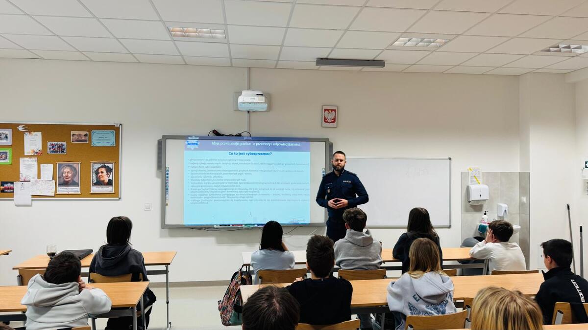 Nawiązując do tej tematyki, policjant omówił również zagrożenia związane z kontaktami z osobami obcymi – zarówno w rzeczywistości, jak i w Internecie. Podkreślił, że nie każda osoba poznana w sieci ma dobre intencje, a próby nawiązania bliższej relacji czy propozycje spotkań powinny zawsze wzbudzać czujność. Wyjaśnił dzieciom, jak reagować w takich sytuacjach oraz przypomniał, że w razie wątpliwości zawsze należy zwrócić się o pomoc do rodziców, nauczycieli lub innych zaufanych dorosłych.